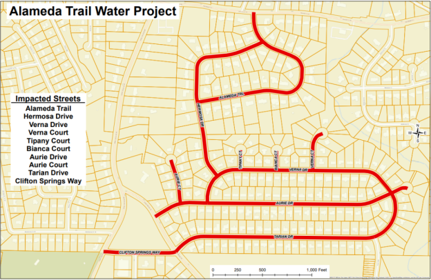 Crews will install 13,100 linear feet of 8- and 12-inch-diameter ductile iron pipe, affecting Alameda Trail, Verna Drive, Verna Court, Tipany Court, Bianca Court, Aurie Drive, Aurie Court, Tarian Drive and Clifton Springs Way.