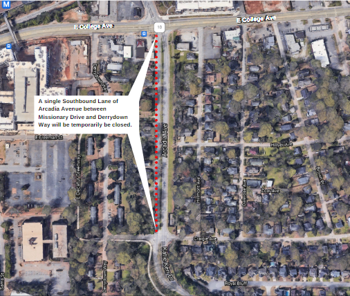 On Aug. 2, a portion of the southbound lane along South Columbia Drive, between Craigie Avenue and East College Avenue, will be closed from 9 a.m. to 2 p.m., while crews work to rehabilitate 532 linear feet of ductile-iron sewer pipe. This section of Arcadia Avenue will reopen on Wednesday, Aug. 7.