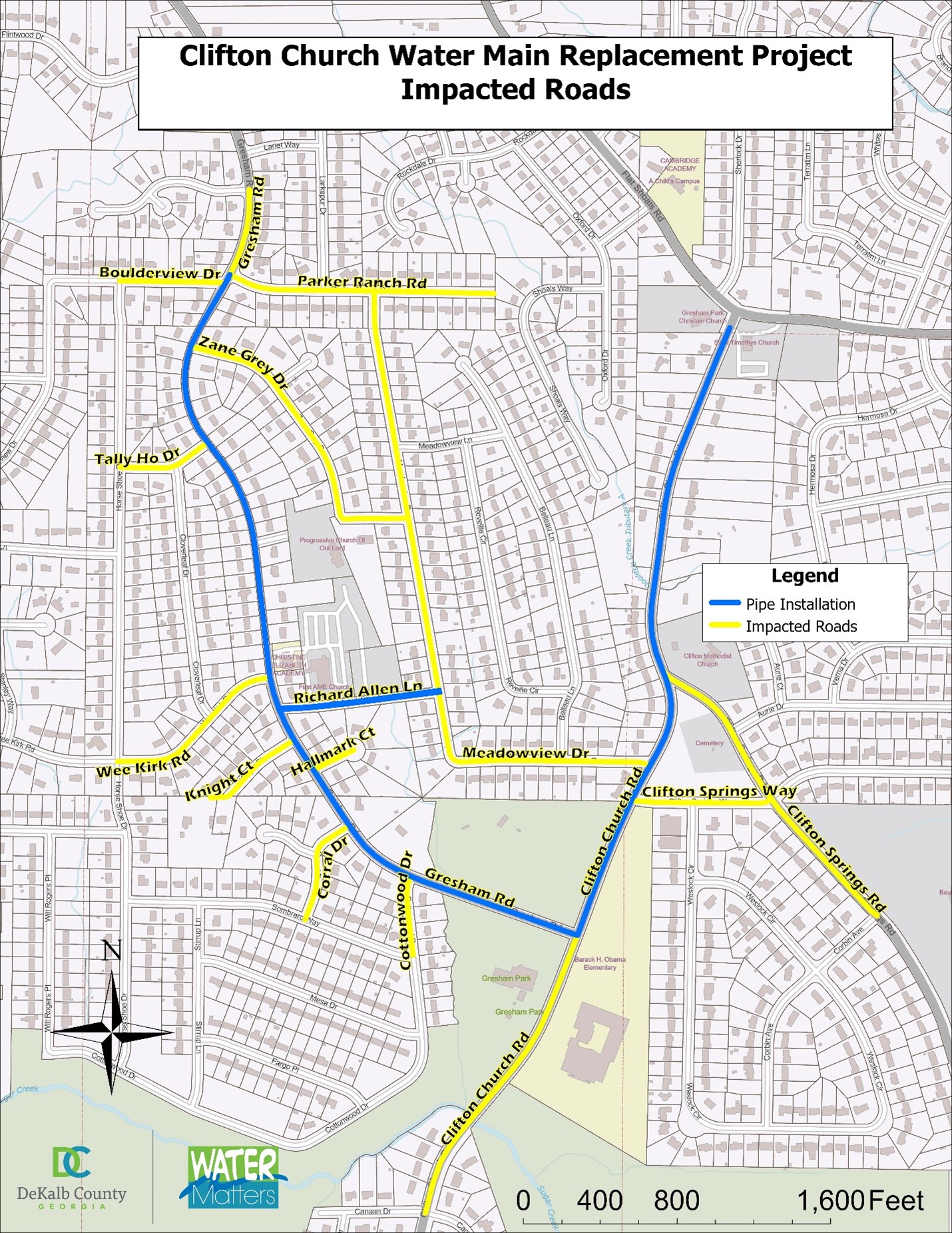Efforts to improve the watershed system throughout DeKalb County continue Monday,Oct. 13, with the launch of the Clifton Church Water Main Replacement Project. Crews will replace approximately 10,900 linear feet of ductile iron water pipe on Clifton Church Road, Gresham Road and Richard Allen Lane.