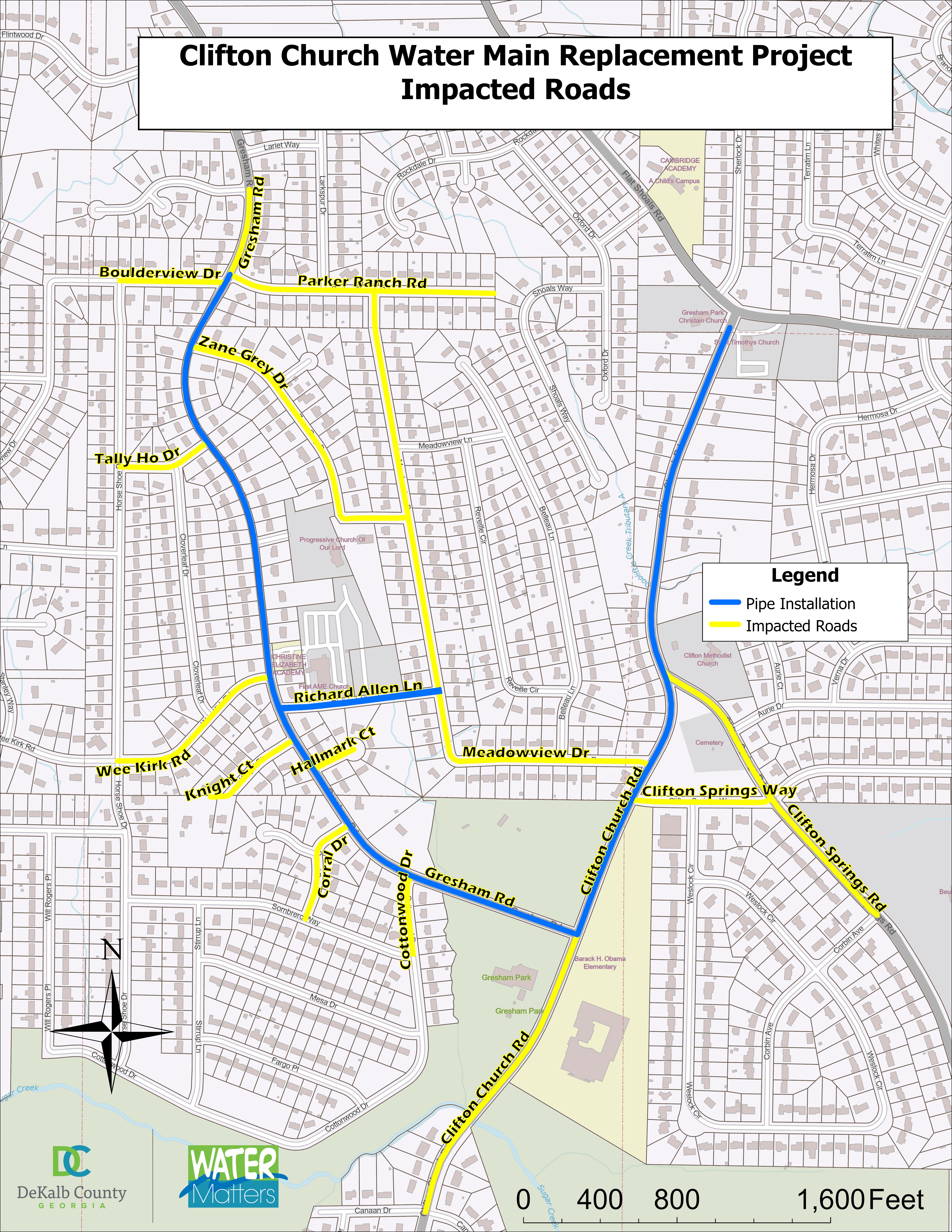 Project Start Date: Oct. 13, 2025 Project End Date: July 2026 | DeKalb County Engineering and Construction Management will host a virtual community meeting for the Clifton Church Water Main Replacement Project on: Tuesday, Oct. 7, 2025, at 6:30 p.m. via Zoom at: https://dekalbcountyga.zoom.us/j/85315291066 |
